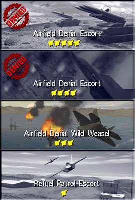 F-22TAWのキャンペーンには10のシナリオが用意されています。これらのシナリオはそれぞれ目的や敵・味方・中立の勢力が異なり難易度に応じたランクが付けられています。プレイヤーのランクによって選択できるシナリオが制限されるので高いランクのシナリオをプレイするには低いランクのシナリオで良い結果を出してプレイヤーのランクを上げなければいけません。