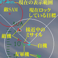 自機に対してミサイルが発射されるとまず警報音が鳴り続けます。そしてそのミサイルが自機にある程度まで近付くとAD上にはミサイルの現在位置と自機とを結ぶ赤い直線が表示されます(AWACS機がいない場合レーダーもしくはIRSTが作動していないと表示されません)。この直線はミサイルが接近するに従い徐々に短くなり長さが0になったとき命中することになります。