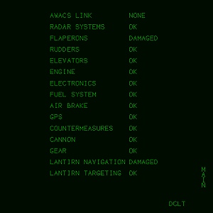 機体のシステムの作動状況を確認できます。OKであれば正常ですがダメージを受けた箇所はDAMAGEDと表示されます。またAWACS機がいない場合にはNONEと表示されます。