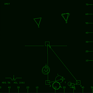 自機のレーダーもしくはAWACSが捕らえた目標は敵機は三角形、味方は円形、地上目標は四角形で表され、各シンボルから伸びている短い線がその目標の進行方向を示しています。