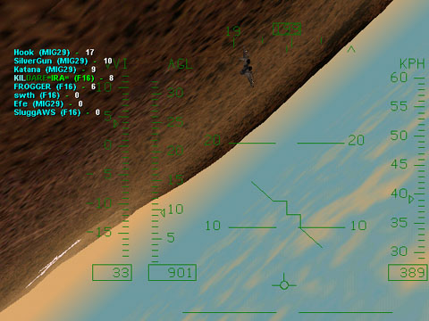 ルールは敵を撃墜したら1ポイントの獲得となり、あるポイント(サーバーの設定による)に一番最初に達した人の勝利となります。ただし地面に激突すると1ポイント減点されます。敵に撃墜された時点では減点にはなりませんがそのまま放っておくと地面に激突してしまうのですぐに[ENTER]キーを押して復帰しなければなりません。