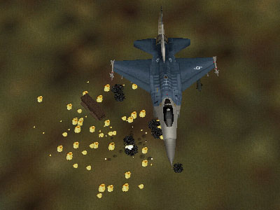 SAMのレーダーが機銃の射程内に入ったら銃撃します。機銃掃射のコツは速度を落とし降下率も低くすることです。速度を落とせばその分攻撃できる時間が長くなりより多くの命中弾を与えられるうえ気分的にも余裕が生まれます。降下率が高いと速度が上がりやすい上、機首上げが遅くれると地面に激突してしまいます。低い降下率で接近するには低空から接近し、そしてフラップを下げて揚力を高くします。フラップは降下率を下げるだけでなく特に機銃の射線がかなり上を向いているF-16では射線と進行方向との差を少なくするという意味でも必要となります。