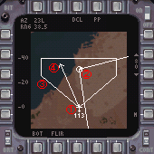 PB7は表示するセンサーキューを切り替えます。'RDR'はHRMキュー、'FLIR'はTargeting IRキューを表示します。いずれの場合も指し示すものが無い場合は表示されません。