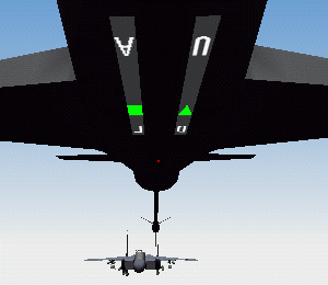 また給油機の胴体下面に取り付けられているインジケーターでも給油位置とのずれを知ることが出来ます。右のA/Fとある方が前後方向、左のD/Uとある方が上下方向のずれを示しています。2つとも中央に緑色の四角形が表示される状態が適正です。