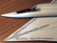 修正を続けるうちに機首部分と主翼部分がだいたい仕上がったのでこれらを接着します。ただこれらの接合部分にもかなりの隙間が出来ます。なるべく隙間が出来ないよう機首部分をかなり強く押しつけて接する基部が広がるようにし瞬間接着剤で固めます。