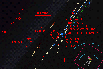 兵器をHARMに切り替え、SAMに捕らえられないようEMCON1で目標に接近します。シュートリストを作成すると幾つかの標的が捕らえられますが、破壊すべきなのはSA-6とSA-11だけです。HUD上では'T'マークがついていることで区別できますが見にくい場合はIRSTの映像で識別します(暗くて見にくい場合はナイトビジョンにします)。目標が4つなのに対し自機に搭載されているHARMも4発なので目標を間違えてはいけません。