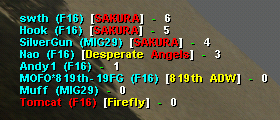 DMではプレイヤー仲間でスコードロン(Squadron:飛行隊)を組むことでチームプレイが可能になっています。スコードロンを組むにはメンバー全員がMultiplayer Optionで同じSquadron nameとpasswordを設定する必要があります。ゲーム中、同じスコードロンのプレイヤー機はアタックディスプレイには味方を表す緑色で表示されます。DMでは[Shift]+[T]でスコードロンのメンバーだけにメッセージを送る事が出来ます。