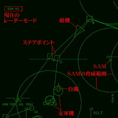自機のレーダーもしくはAWACSが捕らえた目標は敵機は三角形、味方は円形、地上目標は四角形で表され、各シンボルから伸びている短い線がその目標の進行方向を示しています。