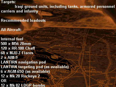 次のミッションはイラクキャンペーン中の典型的なミッションの1つである夜間の地上部隊攻撃ミッションです。このミッションに限らずイラクキャンペーンは最初の訓練を除いてすべて夜間に行われます。また敵航空機の活動が少なく対空兵器が配備されている範囲も重要拠点に限られているためミッション行程のほとんどで脅威が低いのが特徴です。