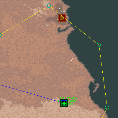 このミッションは移動目標攻撃のため目標の位置というものはありませんが、その代わり重要になるのがマップ上で赤い四角に◎の記号で示された“ブルズアイ”と呼ばれるポイントです。ブルズアイとは作戦地域に1個所設定されるポイントで、作戦中の交信で位置を示す際に頻繁に使われます。この場合市街地にブルズアイが設定されていますが、もし“市街地の西10マイルにいる敵地上部隊を攻撃せよ”という交信を敵に傍受されると敵はその部隊の位置を変えてしまう恐れがあります。しかし“ブルズアイの西10マイルの敵部隊”ならば傍受されても敵にはどの部隊が攻撃されるのか知られることがありません。以前のバージョンではここでブルズアイの位置を記憶しておかねばなりませんでしたがバージョン1.12FではTSDページなどにもブルズアイの位置が表示されるようになりました。